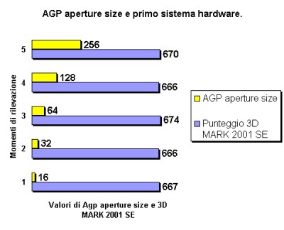 Dai test effettuati con 3D MARK 2001 SE non emerge grande differenza di prestazioni con impostazioni diverse di AGP Aperture Size, se non giustificate da una percentuale trascurabile di variazione dei risultati. Una differenza di 8 punti (674-666), o di 9 punti (4311-4302), o di 15 punti (7785-7770) in seguito ad una modifica del valore di AGP aperture size, indica che la memoria centrale di sistema non viene assolutamente sfruttata dal test 3D MARK 2001 SE, e quindi non può essere preso come riferimento per valutare le impostazioni diverse di AGP aperture size.
