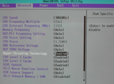 Prima di installare il Windows Xp Professional Service pack 1, abbiamo attivato la tecnologia Hyper Threading nella sezione ADVANCED del Bios della motherboard ASUS P4PE. Come già detto, per accedere al Bios, dovete premere più volte il tasto CANC o DEL all'avvio del sistema, e poi potrete selezionare i menu che vi interessano.